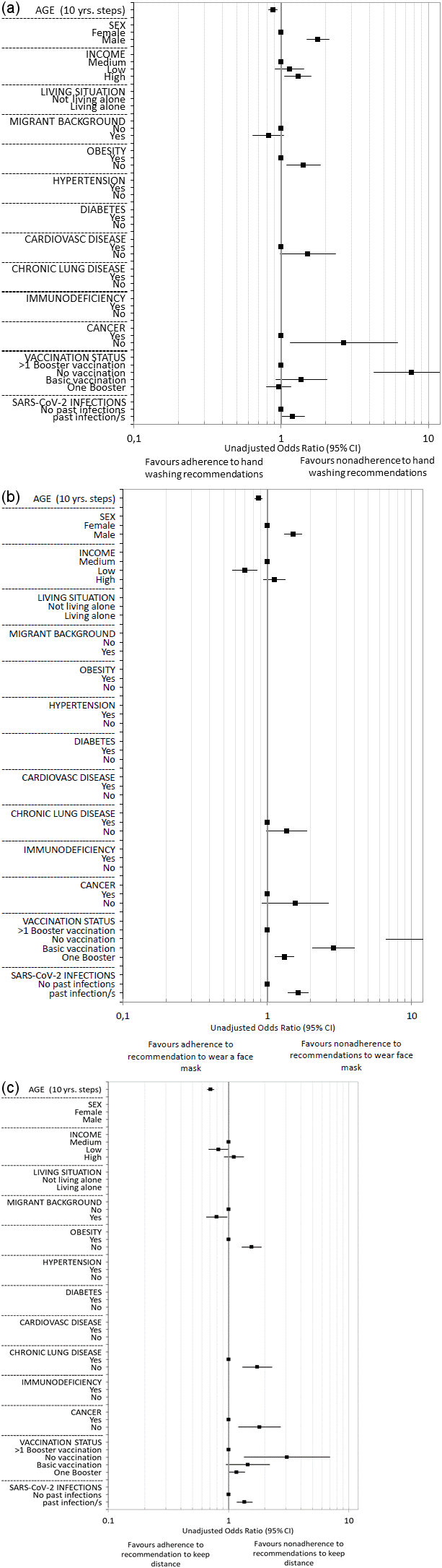 Figure 2: Forest plots of the results of the multivariable (selected model) logistic regressions – (a) associations with nonadherence to STIKO recommendations, (b) associations with nonadherence to hygiene recommendations – (c) associations with nonadherence to recommended notification of all possible contacts after positive SARS-CoV-2 test