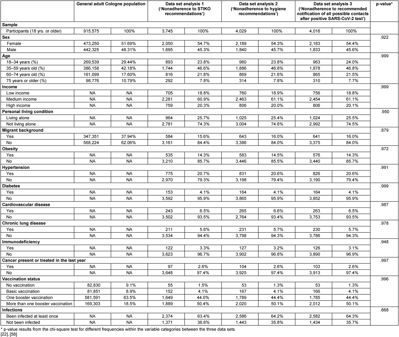 Table 1 [Tab. 1] provides a detailed description of the study participants, divided into three analysis data sets and compared with known characteristics of the Cologne population. A statistical comparison between the three data sets revealed no significant differences across analyzed variables (p=.668–.999, see Table 1 [Tab. 1]). Therefore, statements regarding representativeness apply uniformly to all data sets.