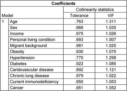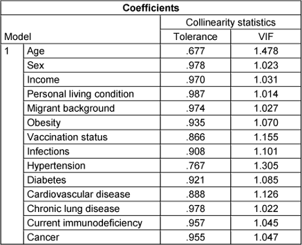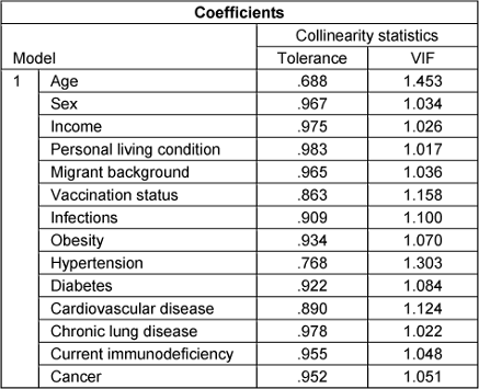 Table 5: Multicollinearity assessment concerning multivariable analysis of associations with nonadherence to STIKO recommendations using tolerance/variance inflation factor (VIF)