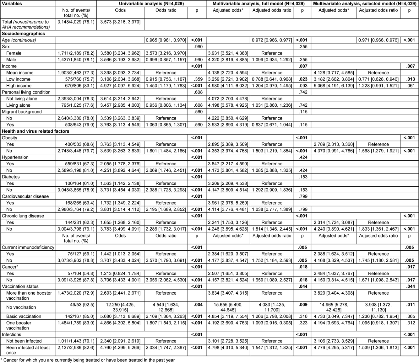 Table 3: Results of univariable and multivariable (full and selected model) binary logistic regression on nonadherence to hygiene recommendations (AHA recommendations)
