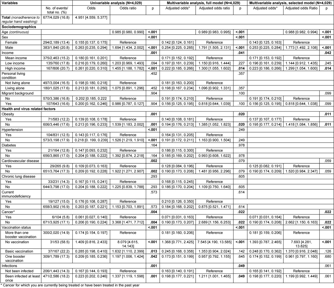 Table 7: Results of univariable and multivariable (full and selected model) binary logistic regression on nonadherence to recommended regular hand washing