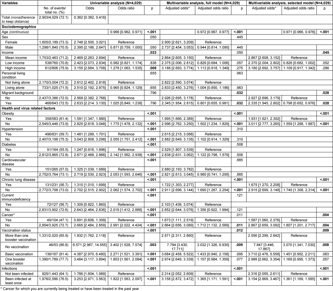 Table 9: Results of univariable and multivariable (full and selected) binary logistic regression on nonadherence to keeping distance