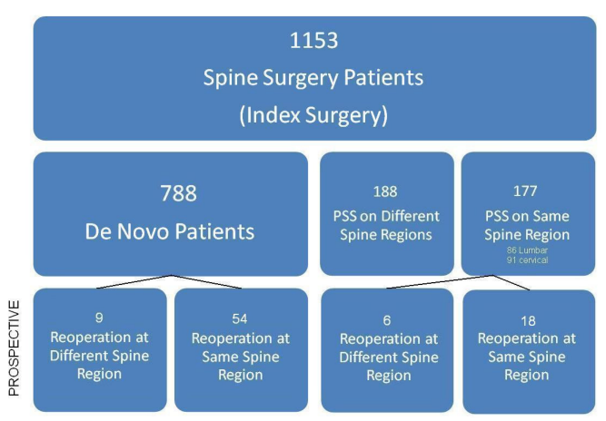 Methods: Data on 1,153 spine surgery inpatients operated between October 2005 and September 2008 (index spine surgery) in regard to the number of previous spine surgeries and location of surgeries (cervical or lumbar) were retrospectively collected. Additionally, prospective follow-up over a period of 2-5 years was conducted.