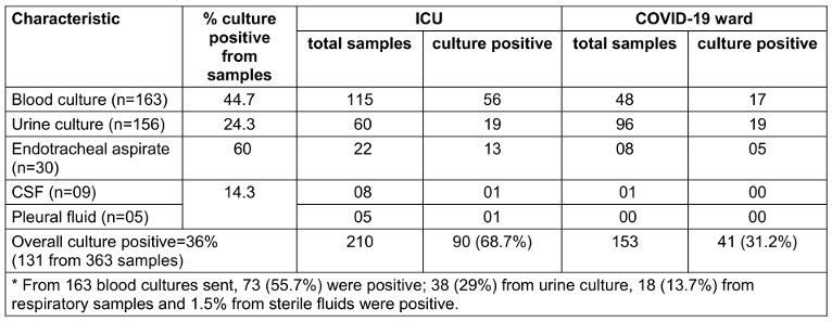 Result: A total of 1301 COVID-19 patients (568 from the COVID ward and 733 from ICU) were admitted to the Covid care ward of a tertiary care hospital. 363 samples were sent for culturing and testing antibiotic susceptibility, of which 131 (36%) were found to be culture-positive (90 from ICUs, 41 from wards). Out of the 143 total isolates thus obtained from 131 samples, the majority (62.2%) were Gram-negative bacteria, and most of them were (70.8%) multidrug resistant.