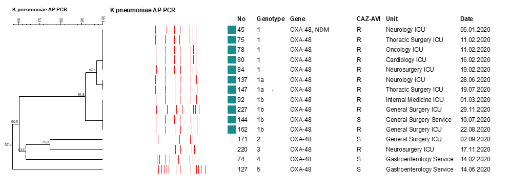 OXA-48 producing CRKP was first demonstrated in Turkey [11]. In later years, OXA-48 spread rapidly among K. pneumoniae strains via plasmids and was detected in many regions of the world, becoming the dominant type in some regions [12], [13]. Conducting surveillance studies showing clonal relationships between bacteria that are not usually included in laboratory routines is extremely important to predict and prevent outbreaks caused by these strains [14]. Due to the prevalence of OXA-48-producing isolates in Turkey, the purpose of this study was to determine CAZ-AVI susceptibility in blaOXA-48-positive CRKP isolates in order to shed light on treatment approaches, contribute to the epidemiological data of the world and our region, and provide data for studies to investigate the role of changes in the blaOXA-48 gene in CAZ-AVI resistance. An examination of the CAZ-AVI susceptibility of blaOXA-48-positive CRKP isolates grown in the laboratory of our hospital in 2020 showed a resistance rate that was quite high compared to Turkish and international data. We suspected that this was a monoclonal outbreak and aimed to perform clonal analysis on CRKP isolates.