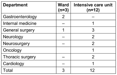 Of the CRKP, 80% (12/15) were isolated from the intensive care unit (ICU), and 20% (3/15) from the ward. The distribution of the isolates according to department is shown in Table 1 [Tab. 1]. The majority of the isolates were taken from blood samples 40%. This was followed by urinary system samples, with 33.3%, and sputum with 26.7%.