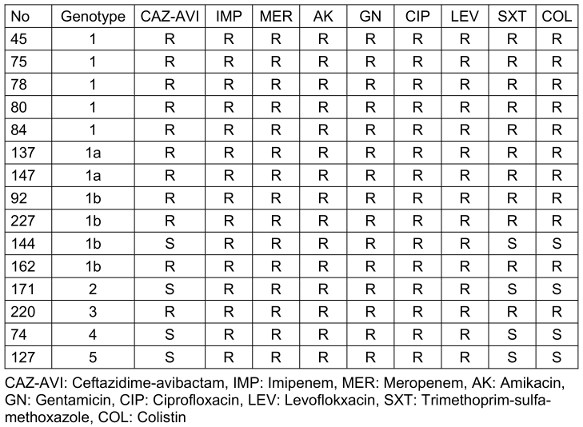 One of the 15 blaOXA-48-positive CRKP isolates was also a blaNDM carrier. All 15 blaOXA-48-positive CRKP isolates were resistant to meropenem and imipenem, amikacin, gentamicin, ciprofloxacin, and levofloxacin. Four (26.7%) CRKP isolates were susceptible to SXT and colistin. 73.3% (11/15) of the blaOXA-48-positive CRKP isolates were determined to be resistant to CAZ-AVI. Three of the four isolates susceptible to CAZ-AVI, SXT and colistin were isolated from patients staying in the ward. All 11 isolates resistant to CAZ-AVI were isolated from intensive care unit patients.