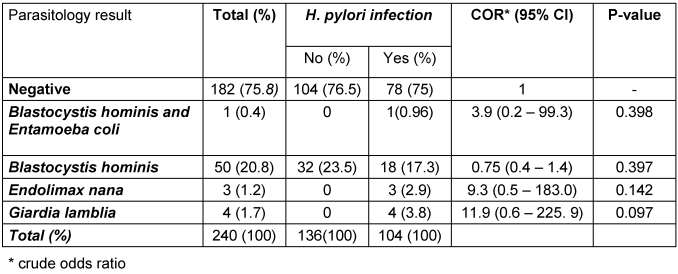 Table 3: Regression analysis of factors related to H. pylori and intestinal parasite co-infection