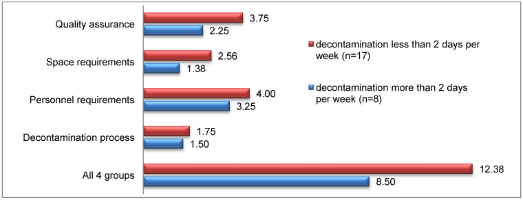 Figure 4: Deficiencies (mean of 6 features per deficiency group) of medical practices, depending on the frequency of the decontamination process