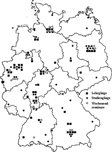 Unter Berücksichtigung der zuvor genannten Einschränkungen zeigt ein Abgleich von Weiterbildungsnachfrage und -angebot, dass insbesondere im Norden und Osten Deutschlands teils weite Anfahrtswege zu leisten sind, um an einer Weiterbildung teilzunehmen und etwa Wochenendseminare kaum vorhanden sind. Dem Wunsch der Nachfrageseite nach einer möglichst kompakten Veranstaltung in Form von ein bis zwei Wochenblöcken steht in dieser Region kein entsprechendes Angebot gegenüber.
