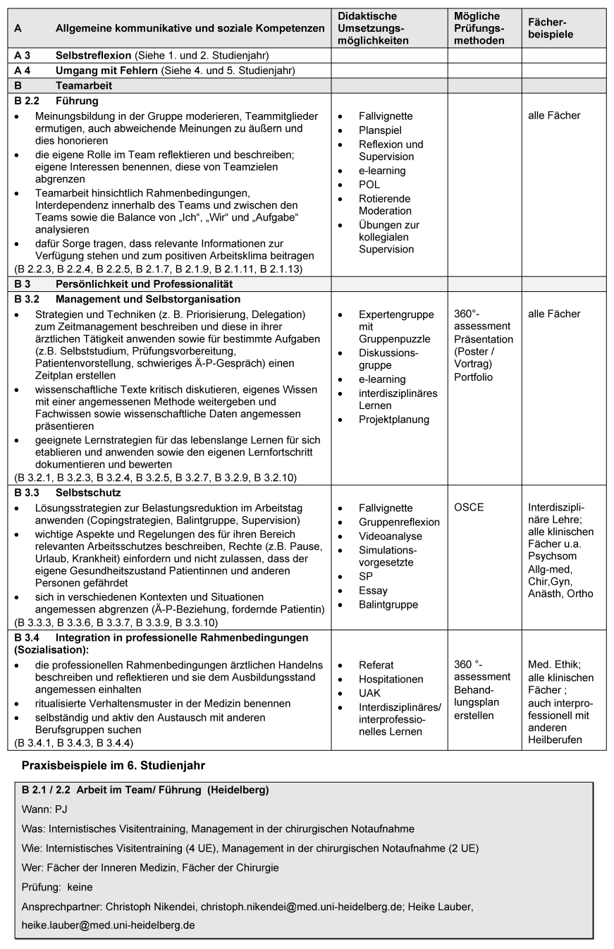 Praxisbeispiele aus einzelnen Fakultäten veranschaulichen die konkrete Umsetzung bestimmter Ausbildungsziele. Bei vielen Lernzielen bieten sich interprofessionelle Unterrichtskonzepte mit anderen Gesundheitsberufen an. Diese Konzepte sind im deutschsprachigen Raum noch wenig verbreitet, dennoch werden diesbezügliche Vorschläge aufgeführt.