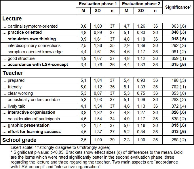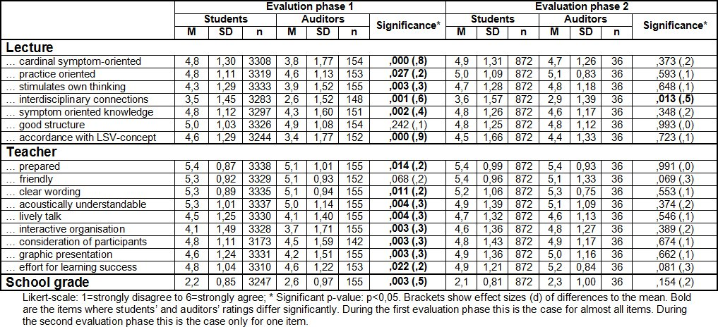 Our study demonstrated that the evaluation of the newly established LSV concept revealed didactic improvements after an intervention as well in the student ratings as in the ratings of trained auditors. These improvements were more notable on the basis of individual items regarding the teachers or the concept rather than on the basis of school grades awarded. Students rated the LSV altogether more positive than auditors who showed a good inter-rater reliability. Apparently, a three hour training session for the auditors is not sufficient to prepare them adequately for their role as givers of analysing feedback. Furthermore, it has to be taken into account, that the generalisability of our results is somewhat reduced because of the choice of a random sample with only 18 lectures in the second evaluation phase due to the methodology chosen. The necessity of a better integration of the LSV in the global concept of the curriculum regarding content and structure with regular quality control is visible in this study. How long the effects of feedback after an evaluation last within the target group needs to be studied in further projects. Mere written information about the lecture design according to modern didactic criteria seems to be an insufficient stimulus for intervention to many teachers to improve or change their lectures. Furthermore, it needs to be checked which effects occur in the indirectly affected group of students, e.g. effects on their motivation or learning success.