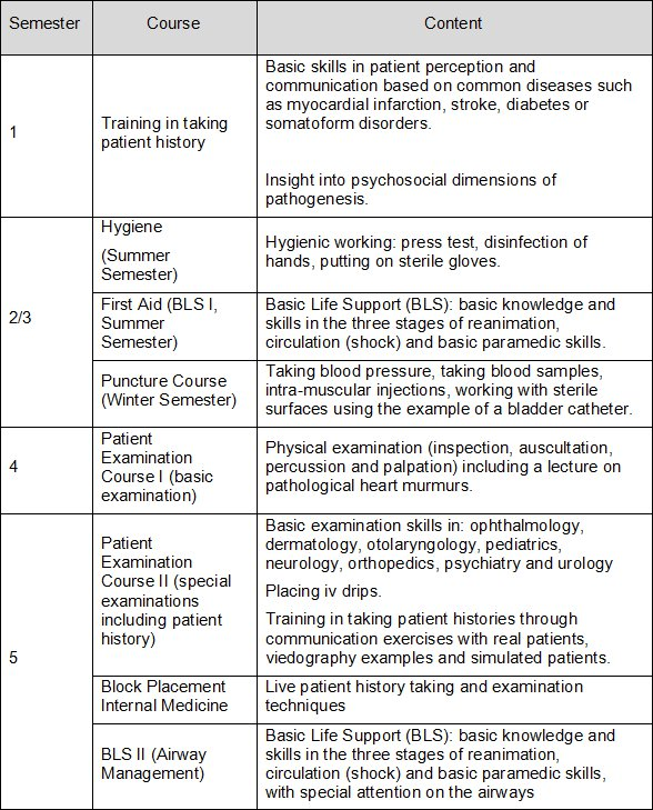 The program running from the first semester of study to Clerkship Maturity was developed in 2003/2004 by an expert task force of the Advisory Board of Study Affairs of the Medical Faculty of the University of Cologne. Starting with the winter semester 2003/2004, and with broad participation from many different disciplines (anesthesia, psychosomatic medicine, transfusion medicine, internal medicine) and following the Delphi-model the “Leitbild Lehre” was developed [5]. To validate this procedure retrospectively, two questions were investigated: