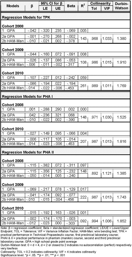 Regression analyses revealed little influence of GPA on practical laboratory performance in all three cohorts (see table 3 [Tab. 3]). In five out of eight models even less than one percent of performance variance in preclinical laboratory courses could be explained by GPA. The incremental variance explained by the HAM-Man was up to 20.5% (see table 3 [Tab. 3]). The practical laboratory performance variables were influenced more strongly by HAM-Man than by GPA, as indicated by the standardized regression coefficients in each multiple regression model, emphasizing the HAM-Man as a stronger predictor of practical laboratory performance in preclinical dentistry (see table 3 [Tab. 3]).