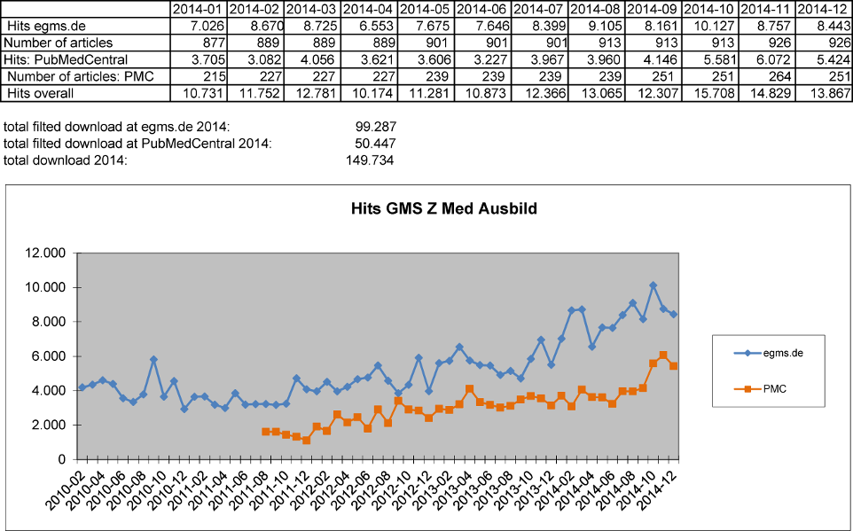 That we are also on the right track for our readers is documented by the growing access of our sites: Both on our “home” platform GMS [http://www.egms.de/en/index.htm] and on PubMed where our articles are also available as full text we enjoy growing popularity (see Figure 1 [Fig. 1]). In 2014 we counted almost 100.000 hits on GMS. On PubMed where our journal is listed only since 2011 we still had almost 50.000 hits. Both measures are corrected for automated queries. Although we are really excited about this response we still want to develop the proliferation of our journal without making any compromises in terms of the quality of our articles. To achieve this and to come closer to the Impact Factor as an important milestone for our journal, we introduce three innovations that we hope will generate positive impetus for this development: