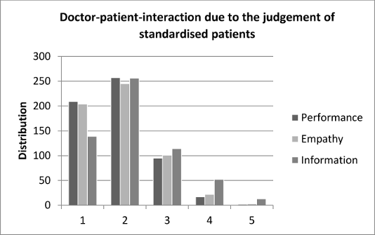Figure 4: Distribution of scores for doctor-patient-interaction in the categories performance, empathy and information (1=very good - 5=unsatisfactory) due to the judgement of standardised patients