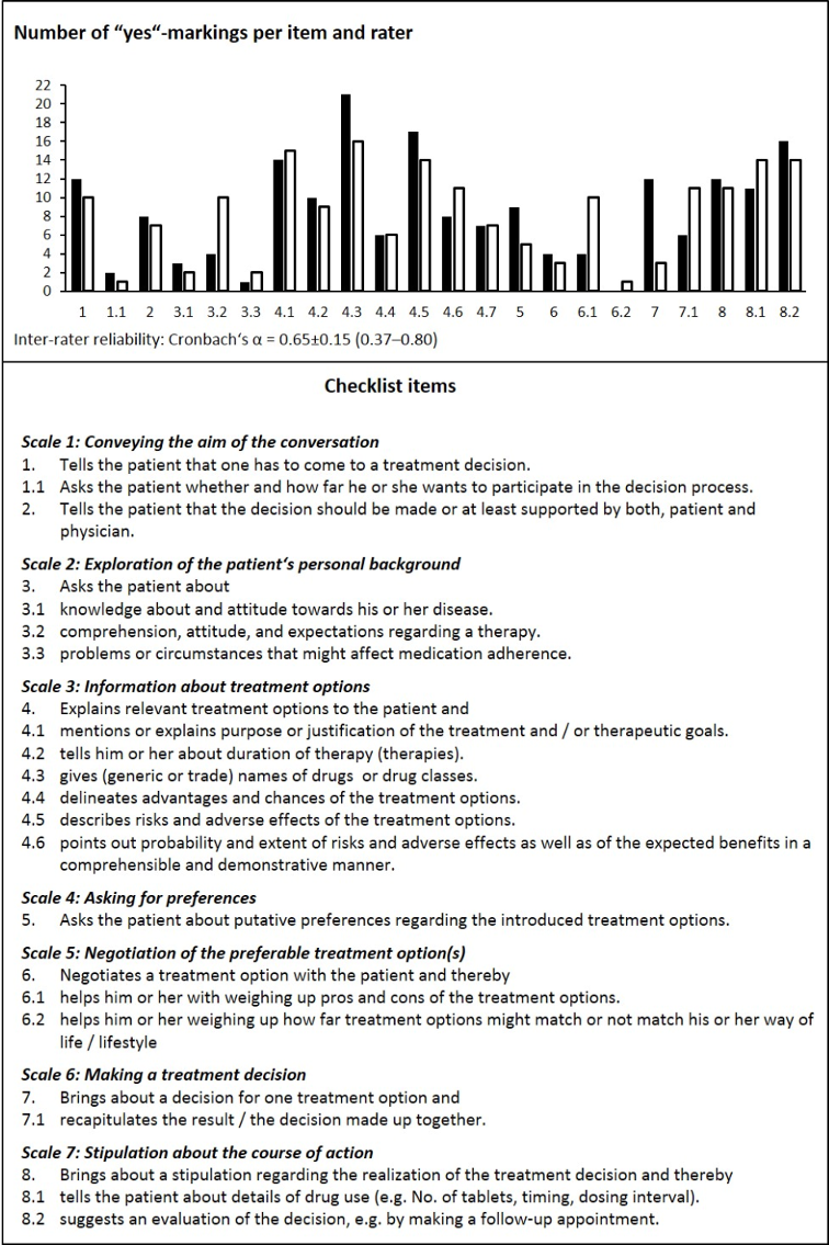 Figure 2: Checklist for evaluating a prescription talk (marking of single items with “yes”, “in parts”, or “no”). Number of “yes”-markings per item by two raters are given who independently assessed 22 simulated conversations.