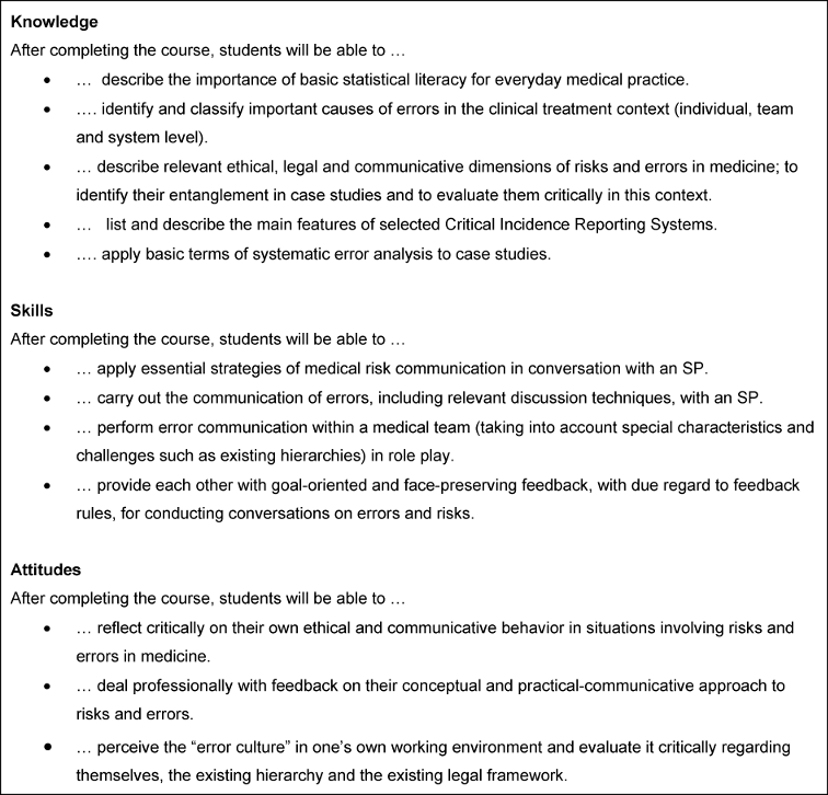 In view of the considerable ethical, legal and communicative requirements in the professional handling of errors and risks as well as the lack of courses offered on these topics for medical students at the Ruhr University Bochum, the authors, for their part expert representatives in medicine, medical ethics, law and linguistics, have co-designed and conducted a series of courses on this issue.