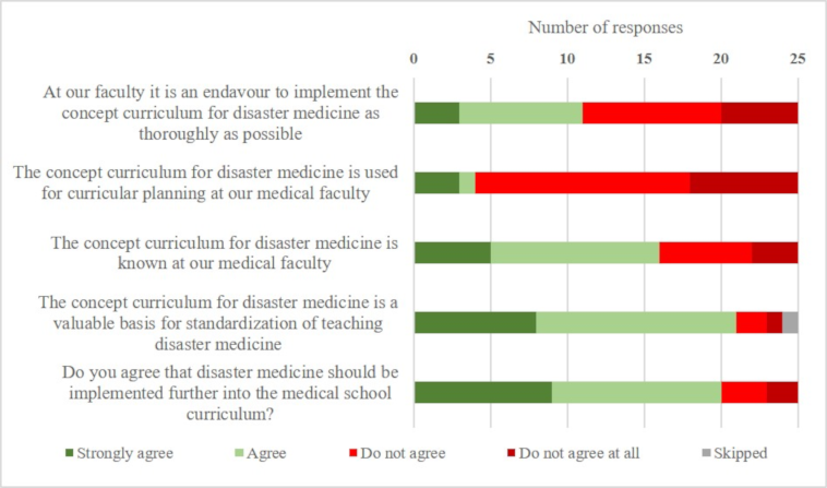 In total, 20 respondents (80%) agreed that disaster medicine should be incorporated further into the medical school curriculum, but in the comment section, some respondents (12%) remarked on the tension between the already mounting workload for medical students and the urgency of implementing disaster medicine. Most medical schools were aware of the concept curriculum’s existence (64%) but only four (16%) schools used it for curricular planning. Twenty-one (84%) respondents agreed that the concept curriculum was a valuable tool for nationwide standardization. Only 11 schools (44%) tried to implement the concept curriculum as thoroughly as possible (see figure 3 [Fig. 3]).
