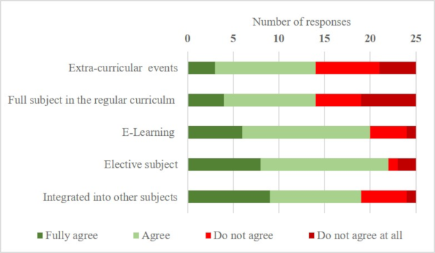 - Options for enhancing teaching in disaster medicine (21 questions, 15x Likert-like Scale, 6x yes/no): This section included questions about preferred teaching methods; which schools had already established administrative structures (e.g. department chair, teaching supervisor) to support disaster medicine and which schools would consider establishing such structures in the future; what barriers to the expansion were identified and consideration to incorporate externally-developed e-learning materials.
