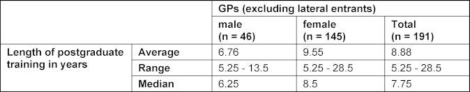 Only two years of postgraduate training in a general practice is required for this group of entrants as opposed to the five-year minimum postgraduate training for general practice recommended by the MWBO [28]. As we define the “real” length of postgraduate training as the period between licensure and having passed the specialist examination, as do Huenges et al. [16] and Broermann et al. [22], the group of lateral entrants must be excluded from the following considerations on the length of postgraduate training.