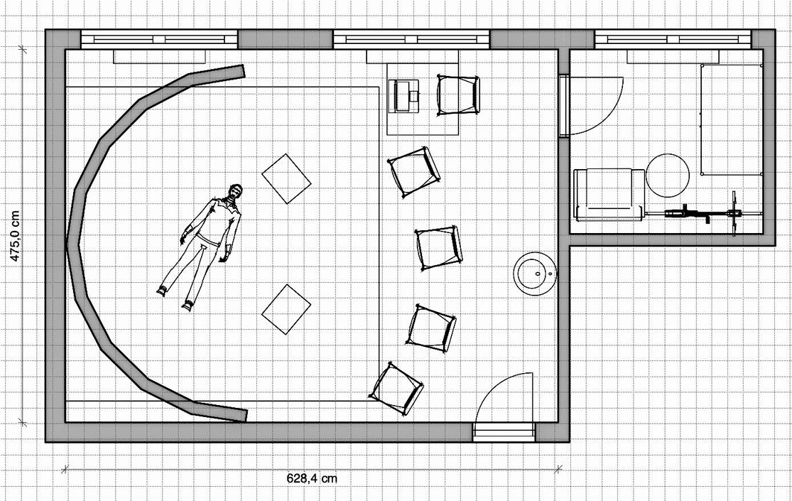 The projection screen of the SAM is a semi-circular, 180° curved wooden construction consisting of several segments and coated with four millimeters of solid white paint. The short-throw projectors and ceiling mounts were placed so far away from the screen that both short-throw projectors illuminated all parts of the screen (see figure 1 [Fig. 1] and figure 2 [Fig. 2]). To combine the two independent projections of the short-throw projectors into a single projection, both short-throw projectors were synchronized using the NVIDIA Surround feature in the 3D Settings menu of the NVIDIA system control. The Immersive Display software allowed the projection to be adjusted to fit the curvature and dimensions of the projection surface (see figure 3 [Fig. 3]). For the panoramic video recordings, the Nikon KeyMission 360 4K was mounted on a tripod one meter above the ground and a five-minute recording was started. To convert the 360° panoramic video footage into 180° panoramic video footage, it was cropped to a horizontal angle of 180° using the video editing program iMovie. Additional sounds were added to the videos as needed. The video recordings can be adjusted to the size of the screen and played back using the QuickTime or VLC player. A dark gray carpet was installed to provide a color-coordinated background for the environment simulation and to make the participants’ knees more comfortable. In addition, a fan to simulate wind, a fog machine and a flash strobe were connected to the SAM via a radio switch set (see table 1 [Tab. 1]).