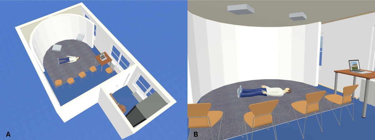 Simulation arenas, that project videos from multiple projectors onto curved screens, to enable a realistic, quickly interchangeable, secure, and standardized environment representation for emergency medical simulations are rarely used in emergency medical education worldwide due to the high development costs, which can exceed 100,000 euros [1], [2], [3], [4], [5], [6], [7], [8], [9], [10]. The semicircular training rooms provide a protected and secure environment and allow the simulation of the wide range of locations and environmental conditions in which emergency medical personnel must operate, but where simulations are not regularly possible, such as busy roads, highways, railways, and even military battlefields [1], [2], [3], [4], [5], [6], [7], [8], [9], [10], [11], [12], [13]. Using video projection, environmental sounds, and flexible props, different scenarios can be quickly interchanged to create a standardized, realistic environment for learning and exams [1], [3], [7], [9], [10], [13]. In addition, environmental simulation can create realistic stress conditions, restrict the regular workflow and challenge the teamwork and interpersonal communication [9], [10], [13], [14], [15]. The high degree of realism in simulation training is of pertinence, as it aims to attain a high level of competence through the seamless integration of learned techniques into daily life and clinical situations [10], [16]. In addition, it can help develop a certain level of stress resistance. Processes such as communication, leadership, and decision-making under stress can be experienced in a targeted manner, while at the same time emphasizing the importance of complying with medical and non-medical safety standards [9], [10], [15]. There is evidence that stress can potentially reduce attention resources, increase distractibility, and impair resuscitation performance [17].