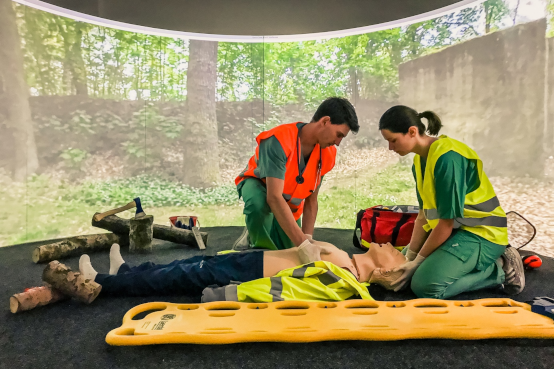 The SAM is the first affordable 180° simulation arena in Germany that enables emergency medical simulations in a realistic, rapidly interchangeable, secure, and standardized environment. It increases stress levels without reducing the quality of resuscitation, providing an optimal learning environment in which stress levels can be tailored to the participants' learning objectives through various parameters.