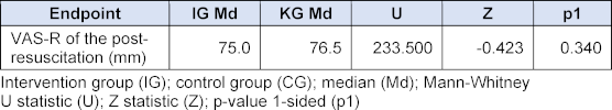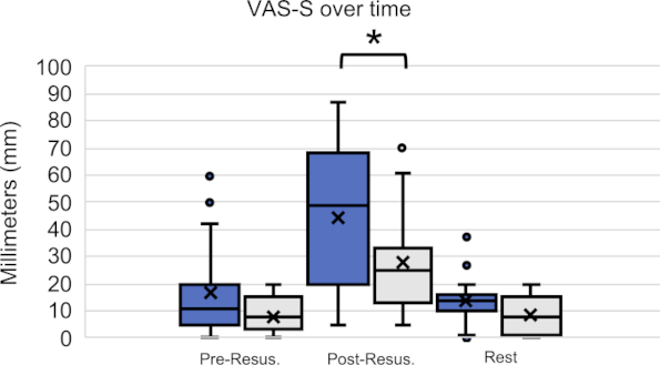 The primary target of subjective resuscitation quality was assessed using a visual analog scale ranging from 0 mm (“poor resuscitation”) to 100 mm (“excellent resuscitation”), which was completed by the subjects immediately after resuscitation.