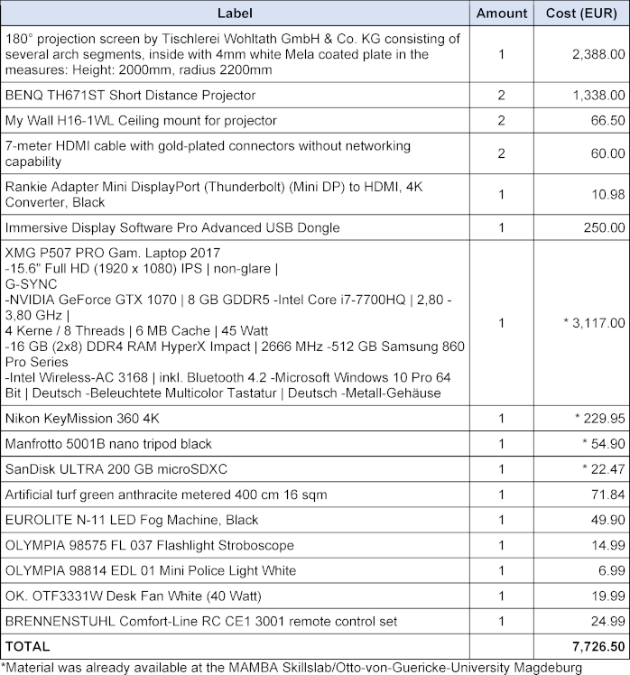 With a development cost of 7,726.50 euros the SAM is the first low-cost simulation arena in Germany [7], [8]. However, due to the lower expenditure, the quality of the video recordings, video projections and ambient sounds will be lower [1], [2], [3], [5], [6], [7]. The diameter of the SAM is also slightly smaller than the diameter of comparable simulation arenas due to the spatial conditions [1], [5], [6], [7], [8], [10]. To provide enough space for the simulation, the SAM has a 180° projection screen instead of a 270° projection screen [1], [3], [4], [5], [7]. In the future, the quality of the environmental presentation could be further enhanced by using several parallel cameras to record the environment, a larger number of short-distance projectors, or several LCD monitors surrounding the simulation arena as screens, as well as stereoscopic three-dimensional projections. The integration of surround sound systems and scent generators has the potential to further enhance the immersive simulation experience. However, research into this topic is still pending [1], [2], [3], [4], [5], [6], [7], [8], [9], [10], [13], [32]. Unlike the arenas in Münster and Essen, developed with external partners, the SAM was built in-house and lacks an external technical contact [1], [2], [5], [6]. In the event that difficulties arise in adjusting the image to the SAM screen, assistance can be obtained by contacting the company Fly Elise-ng. Since its development, SAM has been utilized regularly for curricular and optional emergency medicine courses at Otto-von-Guericke University Magdeburg and Magdeburg University Hospital.