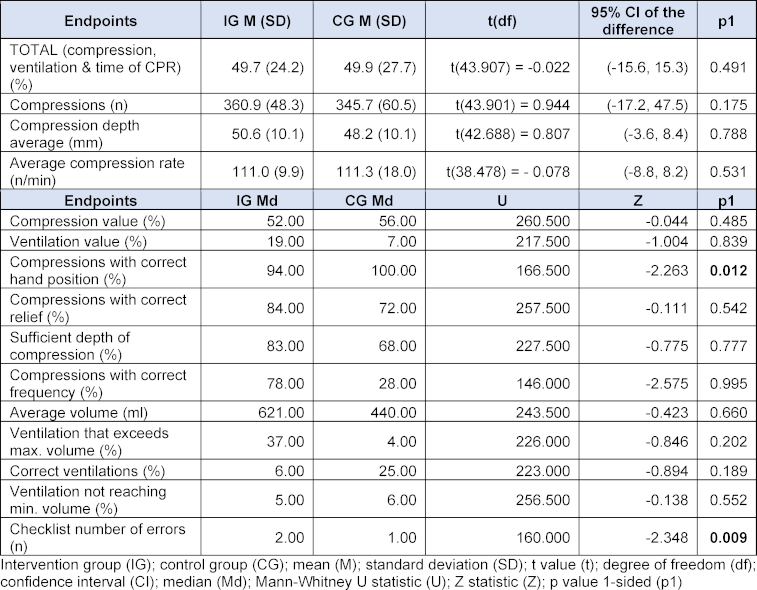 Cardiac reactivity (CR), defined as the difference between the mean heart rate during resuscitation and a baseline period before resuscitation, was used as the primary objective measure of objective stress perception. For this purpose, continuous electrocardiography was performed using the Holter ECG medilog AR12plus (SCHILLER Medizintechnik GmbH, Obfelden, Switzerland). Using the medilog DARWIN2 software (SCHILLER Medizintechnik GmbH), electrical cardiac activity was automatically detected via three leads, verified, and incorrectly detected cardiac activity was manually corrected. The secondary outcome measure of objective stress perception was the heart rate (HR) and the heart rate variability (HRV) parameters SDNN (Standard Deviation of NN intervals), SNS Index (Sympathetic Nervous System Index), SI (Stress Index) and SD2 (Standard Deviation of the distances of the points from the major axis) during resuscitation. HRV analysis was performed using the Kubios HRV version 2.0 software (Biosignal Analysis and Medical Imaging Group, University of Kuopio, Finland). Respiratory rate (RR) was also used as a secondary outcome measure immediately after resuscitation and was continuously recorded by the Vernier Go Direct Respiratory Belt and analyzed using Vernier Graphical Analysis™ 4 software. Finally, the ratio of salivary alpha-amylase activity (sAA) immediately after resuscitation to a resting value before resuscitation was considered as another secondary outcome measure of objective stress perception. For this purpose, three saliva samples were collected from the subjects using saliva cups (SARSTEDT). The participants were instructed to place the saliva collection device's absorbent roll in one of their cheeks for two minutes without chewing or speaking [21], [22], [23]. After being stored at -20°C for a maximum of three days, the samples were subjected to automated in-vitro testing using the Roche Cobas6000 [23], [24], [25]. The samples were thawed at room temperature and centrifuged at 4000 revolutions per minute for ten minutes at room temperature. 10 μl of the sample were mixed with 990 μl of distilled water. After calibrating the measurement system with distilled water and a Roche calibration standard, the measurement was started using the c501 module in serum mode [24]. The Roche cobas c systems automatically calculate the analytical activity of the sample [24]. The conversion factor was: U/Lx0.0167=μkat/L. The kinetic method is based on the cleavage of 4,6-ethylidene-(G7)-1,4-nitrophenyl-(G1)-α,D-maltoheptaoside (Ethylidene Protected Substrate=EPS) by alpha-amylase, followed by the hydrolysis of all cleavage products using alpha-glucosidase (auxiliary enzyme) to p-nitrophenol (100% chromophore release) [24]. The color intensity of the formed p-nitrophenol was directly proportional to the alpha-amylase activity and was determined by measuring the increase in extinction [24].