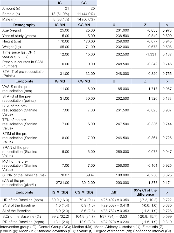 A priori power analysis was conducted using G*Power 3: Statistical Power Analyses from Heinrich-Heine-University Düsseldorf based on a study by Mills et al. on the effects of emergency medical high- and low-fidelity simulations on cardiac reactivity [29]. To obtain statistically significant results regarding cardiac reactivity as the primary target of objective stress perception, a total sample of 38 participants would have been necessary based on these calculations. The participants were randomized into the intervention and control group using the RITA software (Randomization In Treatment Arms, StatSol, Lübeck) prior to the start of the trial. The statistical analysis was performed with the assistance of the Institute of Biometry and Medical Informatics using IBM SPSS Statistics 29 software (IBM, Ehningen, Germany). Descriptive analyses of the variables under investigation were conducted initially. The data was tested for normal distribution using the Shapiro-Wilk test. If the parameters were normally distributed, the Welch test was chosen as the metric test procedure. If the parameters did not follow a normal distribution, the Mann-Whitney U test was used as a non-parametric test. The distribution was tested using the Kolmogorov-Smirnov test for two samples after standardizing the data. The effect size was determined using Cohen’s d for metric methods and Pearson’s correlation coefficient r for non-metric methods.
