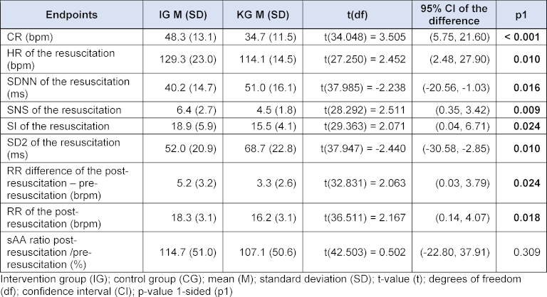 The post-resuscitation VAS-S, as the primary outcome measure of subjective stress, showed a significant difference between IG and CG (see figure 7 [Fig. 7]). Also, the EZ parameters BEA, TEN, STIM and SPAN of the post resuscitation as secondary outcome measures showed significant differences between IG and CG. The secondary outcome measure STAI-S for post-resuscitation showed no significant difference between IG and CG (see table 7 [Tab. 7]). Cardiac reactivity, as the primary outcome measure of objective stress perception, showed a statistically significant difference between IG and CG (see figure 8 [Fig. 8]). The HR and HRV parameters SDNN, SNS, SI, and SD2, as well as the RR difference between the post-resuscitation- and baseline-phase and the RR of the post-resuscitation phase, also showed significant differences between IG and CG as secondary endpoints. The sAA ratio did not show a statistically significant difference between the IG and the CG (see table 8 [Tab. 8]). The VAS-R as the primary outcome measure of subjective quality of resuscitation and the TOTAL score as the primary outcome measure of objective resuscitation quality showed no significant difference between IG and CG (see table 3 [Tab. 3] and table 9 [Tab. 9]). The other resuscitation parameters also showed no significant differences, except for compressions with correct hand position and the number of errors according to the resuscitation checklist (see table 3 [Tab. 3] and figure 9 [Fig. 9]).