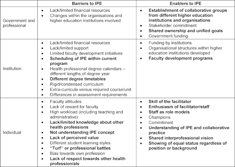 Table 1: Barriers and enablers to interprofessional education (IPE) in higher education institutions according to Lawlis et al. [11]
