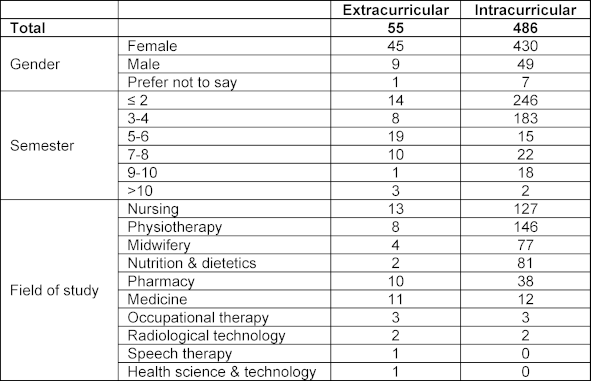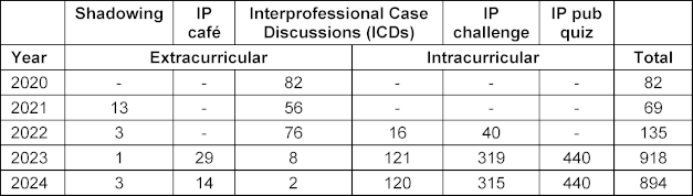Since its founding in fall of 2020 until December 2024 more than 2,000 healthcare students and young professionals participated in one of SHAPED’s IP learning activities. Table 2 [Tab. 2] lists the number of participants in either the extra- or intracurricular setting per year. While SHAPED initially focused on extracurricular activities, the number of participating students increased significantly after their incorporation into the curriculum in 2022.