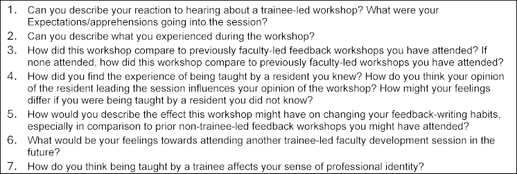 Based on the positive reception of and feedback for the trainee-led faculty development session, we hope that this mode of teaching might be used and explored further, especially in the context of medical education faculty development. As end-users of medical education, trainees are in an ideal place to provide education to faculty members regarding educational practices.