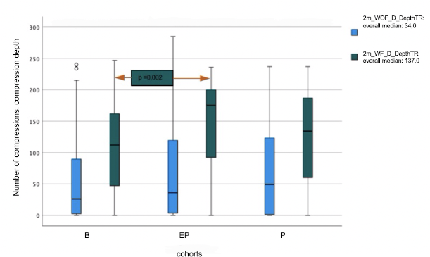 While using the feedback system, B performed compressions within the target range for compression depth with a median of 47.3%, P with 56.9%, and EP with 75.1%. A statistically significant difference was found between B and EP (p=0.002).