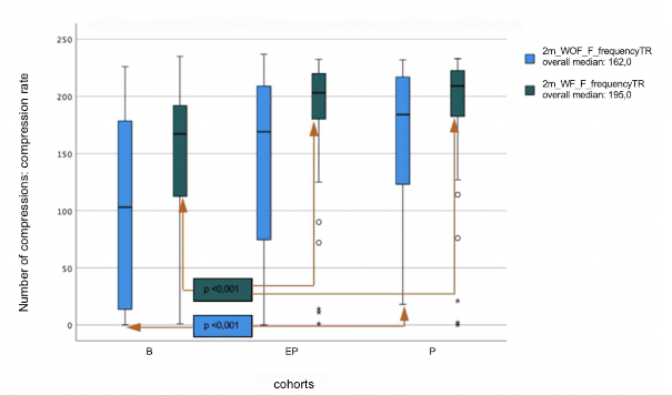 There was no significant difference between the P and EP cohorts in the analysis of either compression depth or compression frequency. Regarding the evaluated parameters, all cohorts were able to improve the quality of chest compressions with real-time feedback. In particular, the bystander cohort benefited from prompt feedback. The comparisons between the cohorts are shown in figures 1 [Fig. 1] and figure 2 [Fig. 2].
