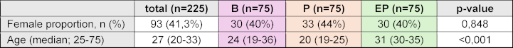 Above the target range for compression depth, B performed compressions with a median of 15%, and EP with 4.7%, while P did not perform any compressions that were too deep. Below the target range for compression depth, B performed compressions with a median of 10.6%, P with 24.8%, and EP with 3.6%. In terms of compression frequency, B performed compressions within the target range with a median of 72.8%, P with 90.7%, and EP with 91.4%. The results between B vs. P and B vs. EP were statistically significantly different with p<0.001. Above the target range for compression frequency, B performed compressions with a median of 16.2%, P with 6.4%, and EP with 0.5%. Below the target range, B performed compressions with a median of 1.5%, P with 0.4%, and EP with 0.5%.