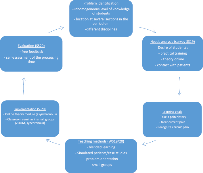 Pain medicine is located in several sections of the medical curriculum. Learning goals regarding Pain Medicine can be found in many disciplines and are summarized in Q 14. Within the cross-sectional area, higher-level learning objectives need to be addressed, which are defined in the National Competence-Based Learning Objectives Catalog of Medicine (NKLM). These include various competences such as identifying pain, applying or assigning treatment methods, and identifying main symptoms [http://www.nklm.de], [1], [2]. Different education concepts of the disciplines involved in Q14 (anesthesiology, psychosomatics, neurology, pediatrics, palliative medicine) pose a challenge for teaching. The prior knowledge of students in the field of pain medicine is equally heterogeneous. With this in mind, we have developed a blended learning concept in fall 2019, in which the needs of the students and the participating disciplines are equally addressed (“SchmerzAktiv 2.0”, see figure 1 [Fig. 1]). Due to the pandemic situation in spring 2020 and the necessity of digitizing the courses, the further development of the project took up an unforeseen speed. The concept was implemented through two consecutive teaching components. Students first completed an e-learning module and then participated in a face-to-face seminar, which was performed as an online group seminar due to the COVID-19 pandemic. The goal of the project was to create a fully digitized learning platform for the cross-sectional area Q14 that would allow all participating disciplines to address the various sub-areas of Q14 without losing a practical component.