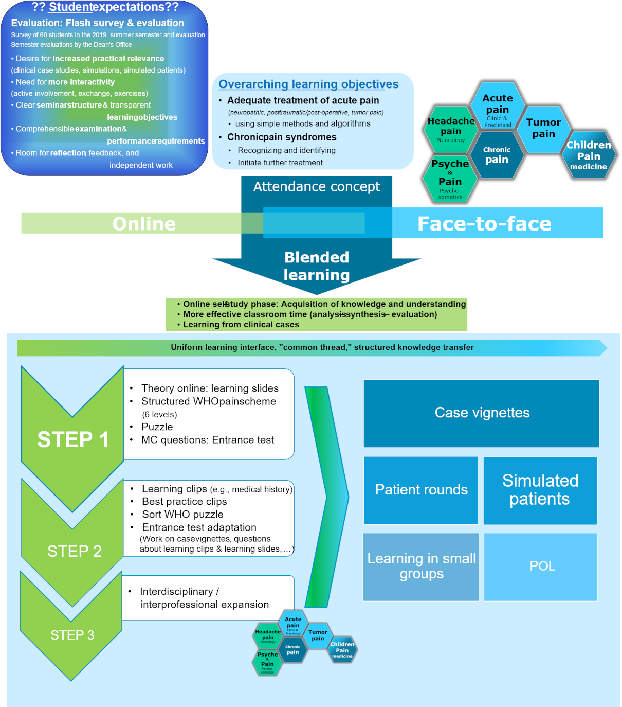 The implementation process was developed by staff members of the department of anesthesiology and was presented in a poster. After recording the challenges of education in the field of pain medicine and the ideas of the students as well as the definition of the learning goals and the teaching concept, a transformation of the previous attendance model into a blended learning concept, was given (see figure 2 [Fig. 2], upper part). The cornerstone of the concept is problem-oriented learning (“POL”) in small groups. This happened primarily through case examples in form of case vignettes but also simulated patients (see figure 2 [Fig. 2], lower part on the right). The further development and implementation of the project was performed in several steps during the following semesters. The goal was to gradually incorporate further learning methods such as videos and interactive elements into the learning platform. As a final step, additional disciplines should be included (see figure 2 [Fig. 2], STEP 1-3). An overview of the development and the initially planned implementation phases of the entire project is shown in figure 2 [Fig. 2].