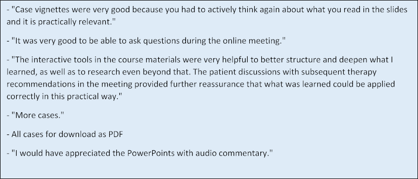 Results: The survey among students revealed a desire for practical training without “frontal teaching”. The resulting project realized this aspect by teaching theory during an online module with case vignettes and interactive learning tasks. The subsequent online presence time during the ZOOM meeting enabled the students to repeat and deepen contents and to ask questions. 170 students completed the entire online program, of which evaluation data were available for 75 students. Self-assessment of completion time averaged at 4-6 hours. In the feedback, 90 aspects were addressed, including mainly comments on content (43%), praise (33%) and comments on technical problems (23%). According to the assessment of the presenters, the students were able to carry out the pain anamnesis survey in a structured manner. The submission of the therapy proposal, however, represents a particular hurdle.