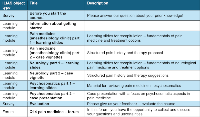 From our point of view, the results indicate that it is possible to depict the different sub-areas of Q14 adequately with a completely online teaching concept (e-learning and online presence phase) and to present the interdisciplinarity of pain medicine without losing the visibility of the participants.
