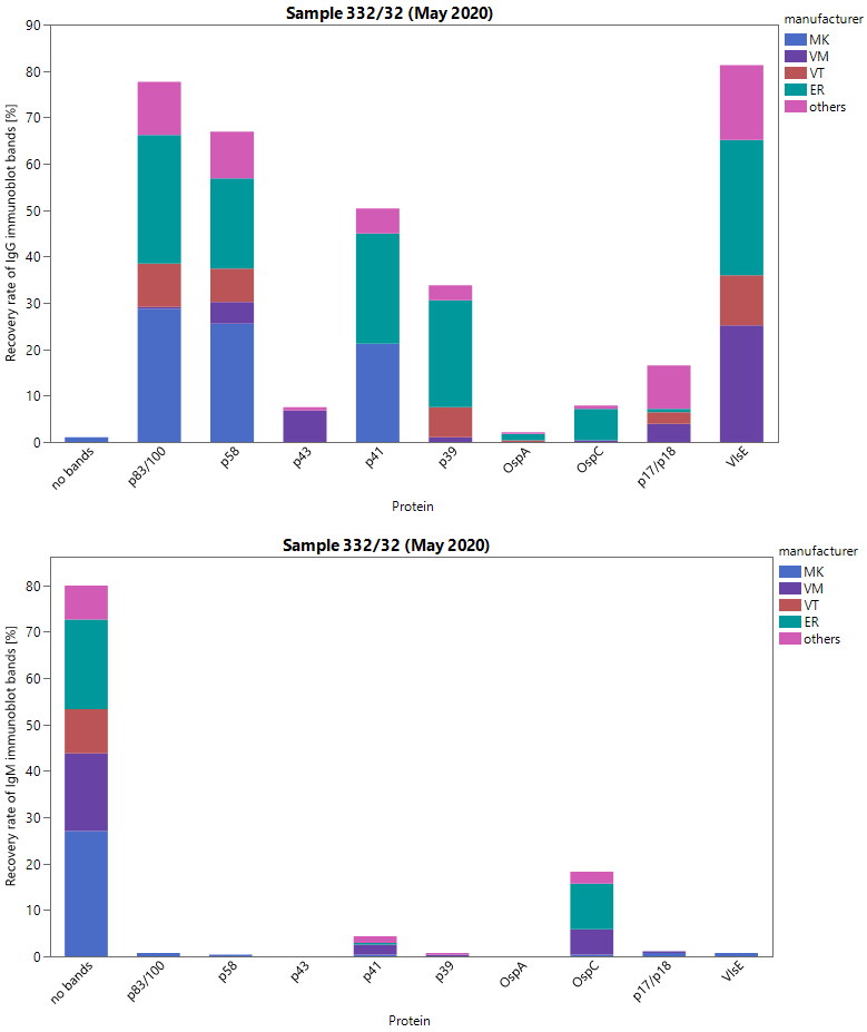 Figure 3: Manufacturer-specific distribution of immunoblot bands for sample 32 (IgG and IgM)