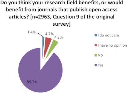 Die Analyse der positiven Freitextantworten ergaben, dass 32% „scientific community benefit“, gefolgt von finanziellen Aspekten (20,8%) und „public good“ (17,4%) als Gründe für ihre positive Meinung von Open Access angaben.