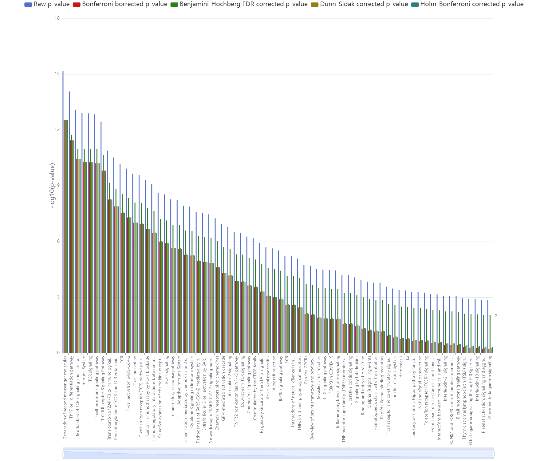 In addition to the tabular demonstration of the pathway enrichment, there is a graphical visualization. A bar plot (Figure 2 [Fig. 2] and Attachment 3 [Att. 3]) shows the –log10(p-value) for the raw p-values and the different corrected (BC, FDR-, DS-, HB-correction) p-values for each pathway. It is possible to zoom in and out with the slide bar. The bar plot demonstrates that the BC is the strictest correction. In contrast, the FDR-correction is the least strict. However, the p-value is strongly reduced by each correction method. The FDR-correction demonstrates that with increasing rank the distance to raw p-values is decreased. Also, the black dashed line defines the threshold. The last ten pathways are only considered due to the FDR-correction.