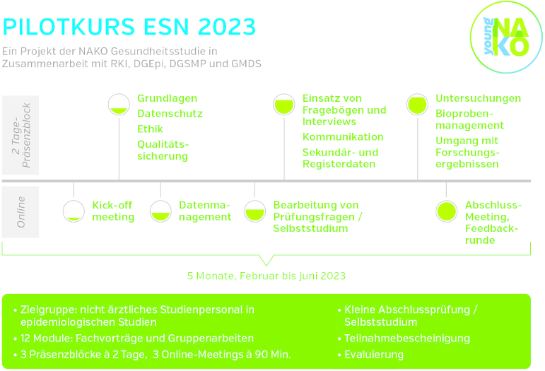 Project description: The development of a concept for a pilot course was initiated by a project group from the study centers of the German National Cohort (NAKO) in early 2020. It was carried out in close collaboration with the Robert Koch Institute (RKI) and the professional societies “Deutsche Gesellschaft für Sozialmedizin und Prävention” (DGSMP), “Deutsche Gesellschaft für Epidemiologie” (DGEpi), and “Deutsche Gesellschaft für Medizinische Informatik, Biometrie und Epidemiologie e.V.” (GMDS). A training plan with 12 modules covering the relevant contents of the GEP was defined and a timetable was drawn up. Those responsible for the modules and teachers as well as participants in the pilot course were recruited through inquiries from the institutions mentioned above. After each module, the expectations and satisfaction of participants and teachers were surveyed. The pilot course was financed by the participating institutions from their own resources.