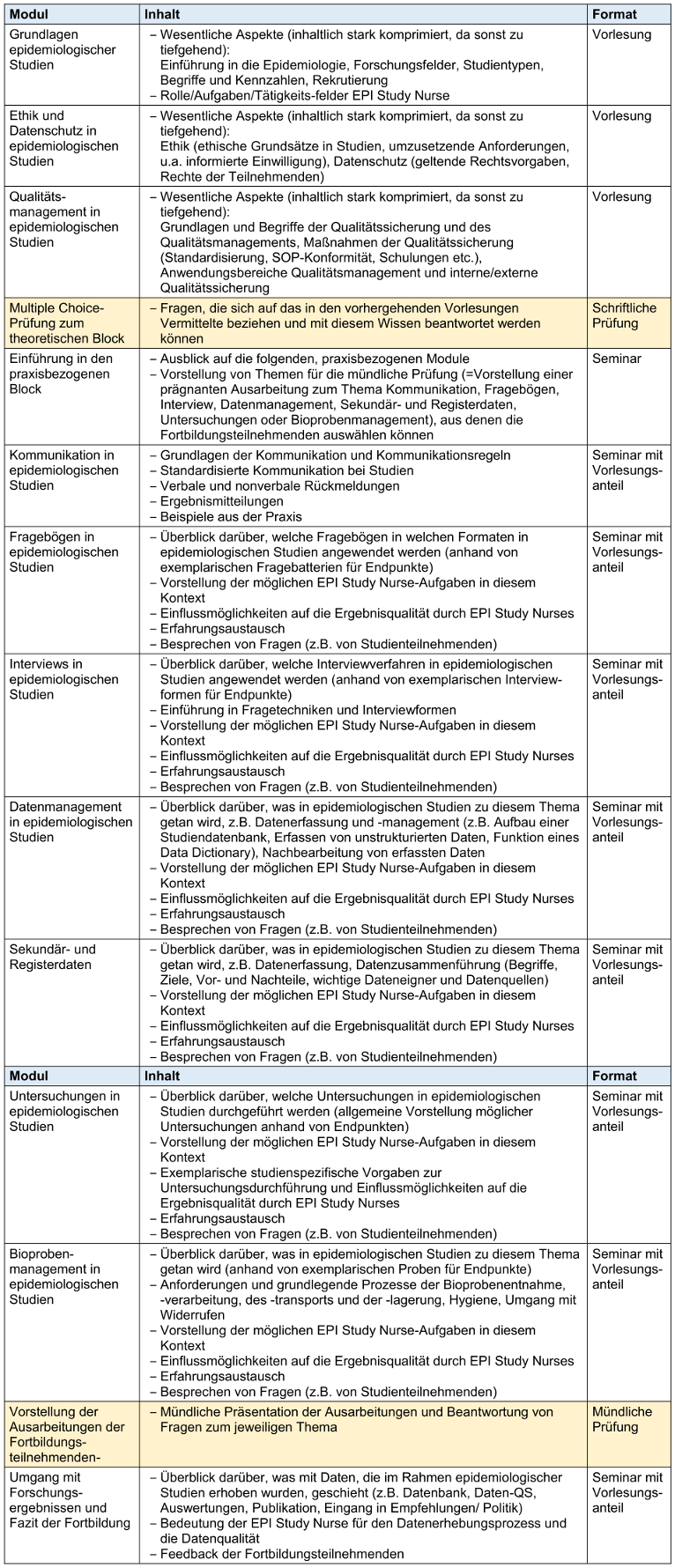 Anders als bei klinischen Studien, für die die Qualifizierung als „Clinical Study Nurse“ etabliert ist [4], [5], [6], fehlt für das Studienpersonal epidemiologischer Studien eine analoge Qualifizierungsmöglichkeit, die sich ggf. auch bei der Suche nach geeignetem Personal mit Aussicht auf den Erwerb einer Zusatzqualifikation positiv auswirken könnte. Aus diesem Grund hat eine Projektgruppe aus Studien- und Qualitätsverantwortlichen die Entwicklung und Pilotierung eines entsprechenden Fortbildungsangebots umgesetzt. Im weiteren Verlauf des vorliegenden Fall-Berichts werden die Projektentwicklung, die Pilotierung und die Evaluierung vorgestellt und mögliche nachhaltige Etablierungsmöglichkeiten diskutiert.