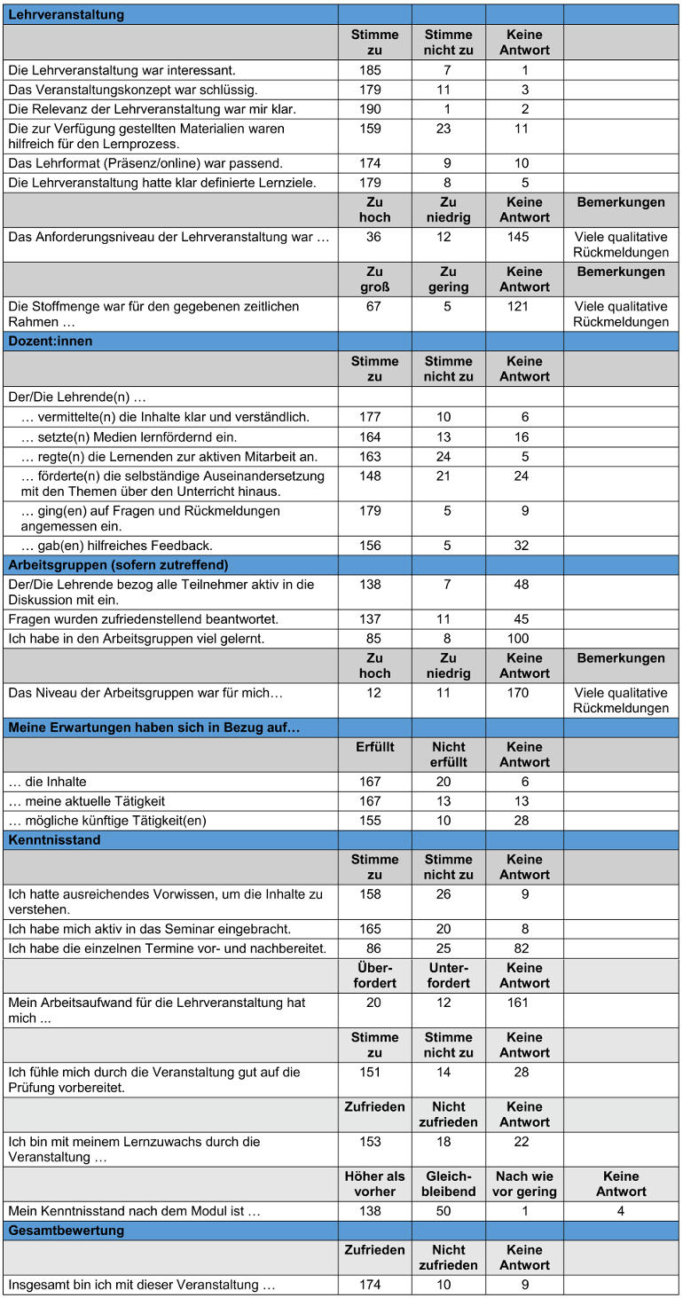 Von den Teilnehmenden wurde des Weiteren gewünscht, möglichst viele Dozent:innen aus verschiedenen Institutionen und Fachbereichen zu gewinnen, um unterschiedliche Experten-Perspektiven kennenzulernen und so das Lernerlebnis zu bereichern. Abschließend wurde hervorgehoben, dass die Richtlinien für die Prüfung schon zu Beginn des Kurses kommuniziert werden sollten. Zur Bestätigung des Lernerfolgs sollten die Prüfungsergebnisse zeitnah zurückgemeldet werden.