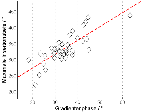 Abbildung 3: Vergleich der maximalen Insertionstiefe (maxAID) des Elektrodenträgers mit der Gradientenphase des Elektrodenpaars E20–E10, das in der Korrelationsmatrix die höchsten Korrelationswerte aufweist. Es zeigt sich eine positive Korrelation zwischen maxAID und der Gradientenphase (R=0,798, p<0,0001).